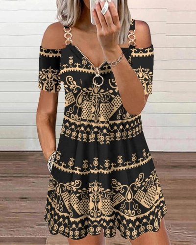 Kadın kısa kollu aksesuar fermuarlı etnik desen mikro elbise