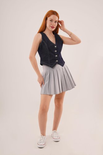 Düğme Ve Ön Dikiş Detaylı Lacivert Jean Yelek